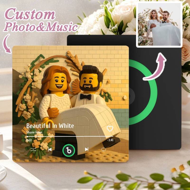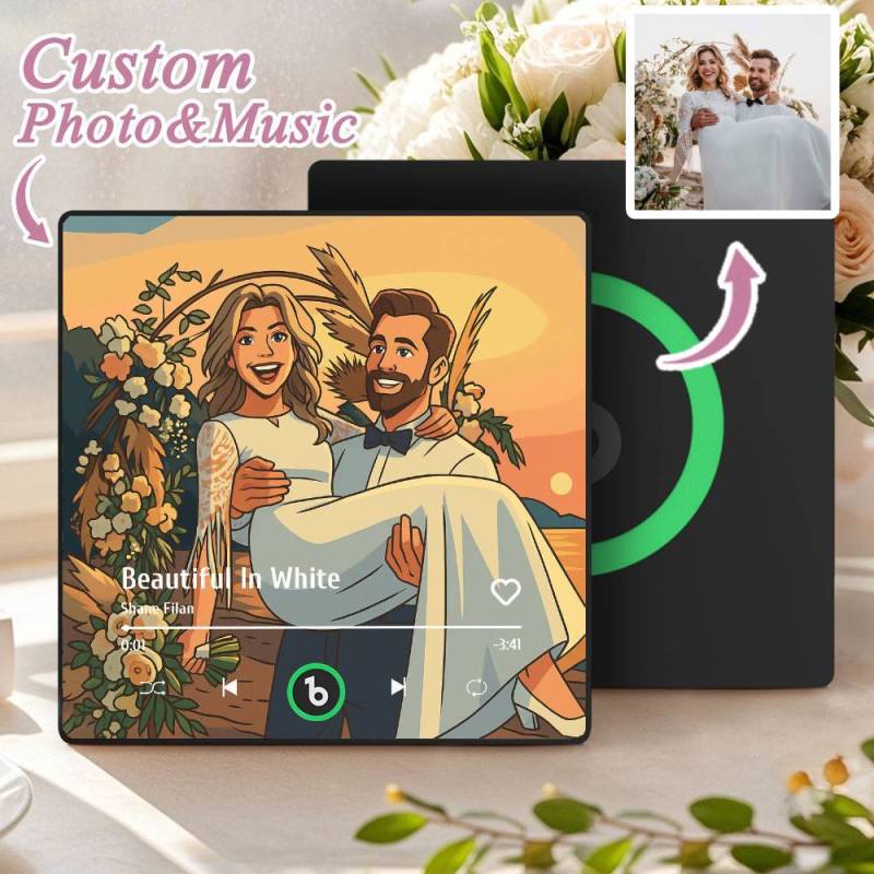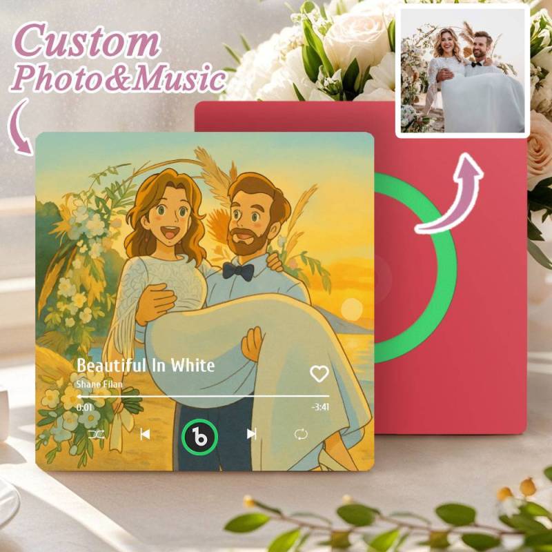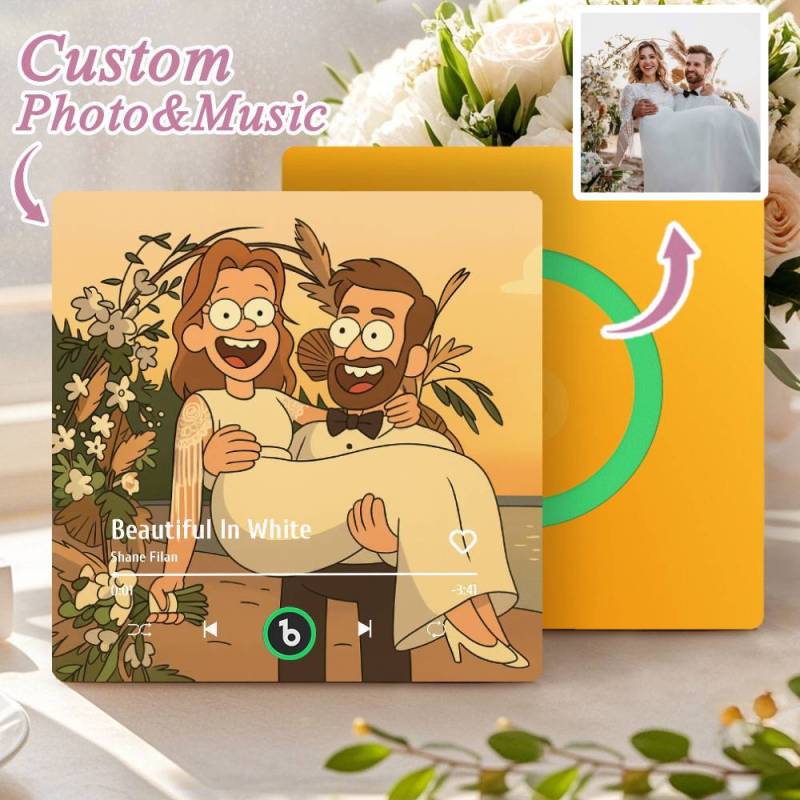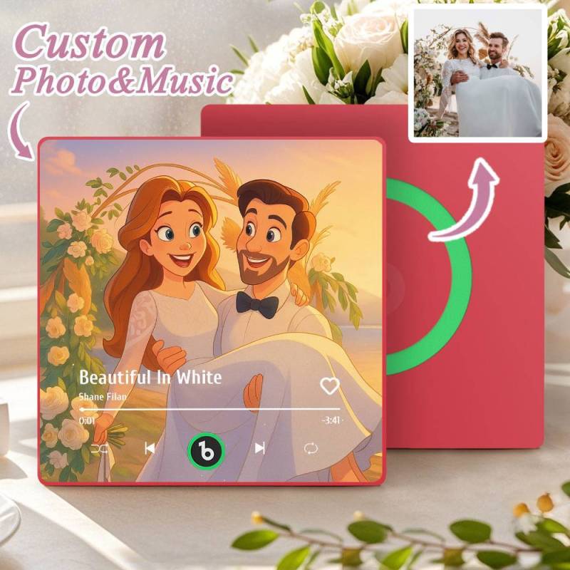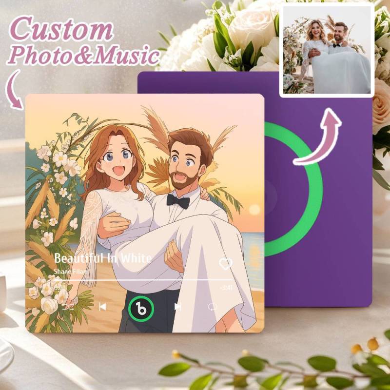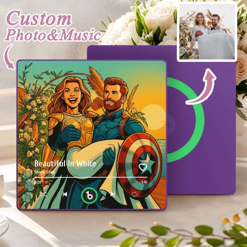 カスタム音楽冷蔵庫マグネット。パーソナライズされた写真。様々な漫画スタイルの歌を再生できる冷蔵庫マグネット。結婚祝いやカップルへの記念日の贈り物。